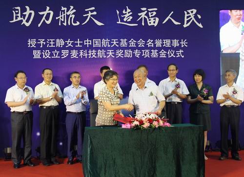 2016年7月13日,“授予罗麦科技集团董事长汪静中国航天基金会名誉理事长暨设立罗麦科技航天奖励专项基金仪式”在北京航天城协作楼隆重召开。仪式上,中国航天基金会理事长、原中国人民解放军总装备部副部长张建启中将高度评价汪静董事长对促进航天事业发展,支持国防事业方面做出的重要贡献,双方共同签署罗麦科技航天奖励专项基金设立协议,罗麦科技集团将捐赠1500万元用于奖励航天领域优秀学子和突出贡献者,为促进我国航天后备科技队伍建设,为实现中国梦强军梦贡献力量。