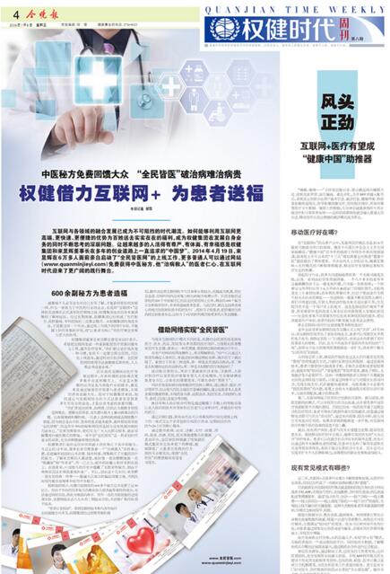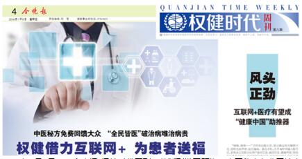 2016年7月8日,《今晚报•权健时代周刊》整版刊发了题为《中医秘方免费回馈大众 “全民皆医”破治病难治病贵 权健借力互联网 为患者送福》的专题报道。