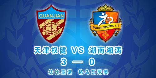 天津权健队3比0胜湖南湘涛华莱队 获六连胜