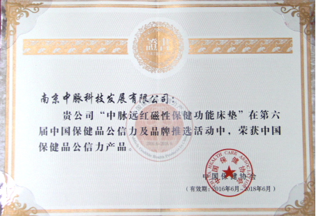 6月18日,第六届中国保健品公信力论坛暨第六届中国保健品公信力产品及品牌推选活动发布会在人民网演播大厅举行,“第六届中国保健品十大公信力品牌”及100个公信力产品同时发布。经过网络严格评选,活动产生了中脉牌、等十大公信力品牌和中脉远红磁性保健功能床垫、中脉远红护腰(舒适型)等100个公信力产品。