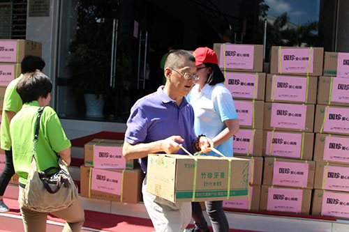 7月15日一早,福建分公司与近百名国珍志愿者前往闽清、永泰,为灾区同胞送去急需的毛巾、牙刷、牙膏、大米、油茶籽油、松花能量饼等生活物品。