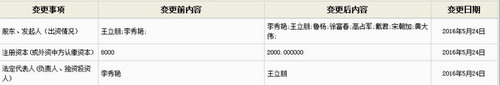 本网编辑还查询到该公司在2016年5月24号将以前8000万注册资金变更成2000万,原法人李秀艳变更成王立朋,股东由王立朋和李秀艳二人股东变更成李秀艳、王立朋、鲁杨、徐富春、高占军、戴君、宋朝如、黄大伟。一般的公司都是将注册资金升级成8000万,注册资金降下来还是令人不解。