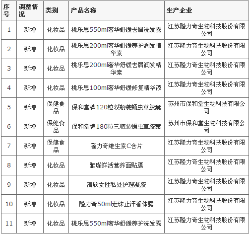 2016年7月21日,商务部直销行业管理信息系统网站公示江苏隆力奇生物科技股份有限公司调整直销产品信息。隆力奇此次新增化妆品8款、保健食品3款。详情如下: