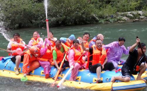第二站,绿之韵的家人们前往素有“天下第一漂”美誉的猛洞河漂流,感受与水搏斗的激情和清凉。水枪、水瓢、雨衣等打水仗的“武器”装备齐全,只见河中水花飞舞、水柱横飞,还未坐上船伙伴们就纷纷“湿身”了。拐一百五十五个弯,在一百三十三个滩潭中穿梭而行,途径三角岩、鸡笼门、落水坑瀑布、梦思峡……绿之韵家人顺流而下,在这里放歌长啸,戏水嘻闹,找回快乐的自我。