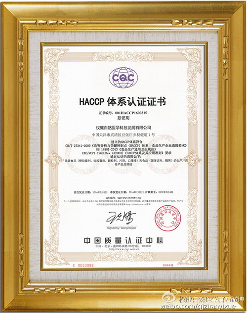 2016年6月6日-6月10日,中国质量认证中心(CQC)天津评审中心对权健集团HACCP危害分析和关键控制点体系进行了为期5天的现场审核,经过审核组严格认真细致的现场检查及文件记录的检查,2016年7月5日,权健集团顺利取得HACCP体系认证证书。