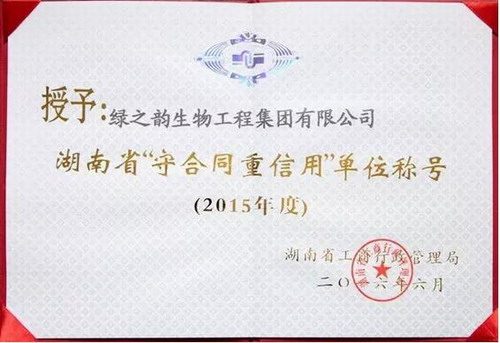 守合同、重信用的诚信经营史,是绿之韵良性经营、健康发展的企业之根本。十三年来,绿之韵始终秉承“和诚立信、竞超兴业”的发展理念,把“守合同、重信用”作为企业发展的生命线,持续推进企业诚信建设,致力于企业品牌打造。在经营规模日渐攀升的同时,公司合同信用管理体系日益健全,保持经营行为规范,履约状况良好,经营效益不断提高,取得了慢发而先至的跨越式发展。获评2015年度湖南省“守合同重信用单位”荣誉称号,是对绿之韵集团守法经营、依法纳税、讲究信用、诚信经营、品牌影响的充分肯定,绿之韵将一如既往,再接再厉,不断提升企业诚信建设工作水平,努力为广大消费者提供更加优质、满意的产品和服务。