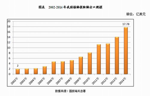 近年来,医药行业的发展遭遇了诸多困难,但是"植物提取物产业",无论是出口还是内销,却逐渐地成为中药行业发展中最为迅速的一个产业。根据海关数据,2002年我国植物提取物行业出口额仅为2亿美元,至2011年便已突破10亿美元大关,达到了11.30亿美元。2014年我国植物提取物出口额跃升至17.78亿美元,同比增长25.88%,发展速度快。