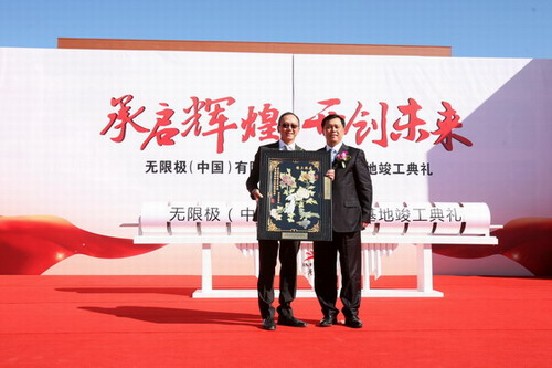 2014年10月,营口生产基地竣工,这是无限极(中国)有限公司的第二个生产基地,也是无限极在北方建立的第一个生产基地。图为营口经济技术开发区党工委书记王立群先生向李惠森董事长赠送贺礼