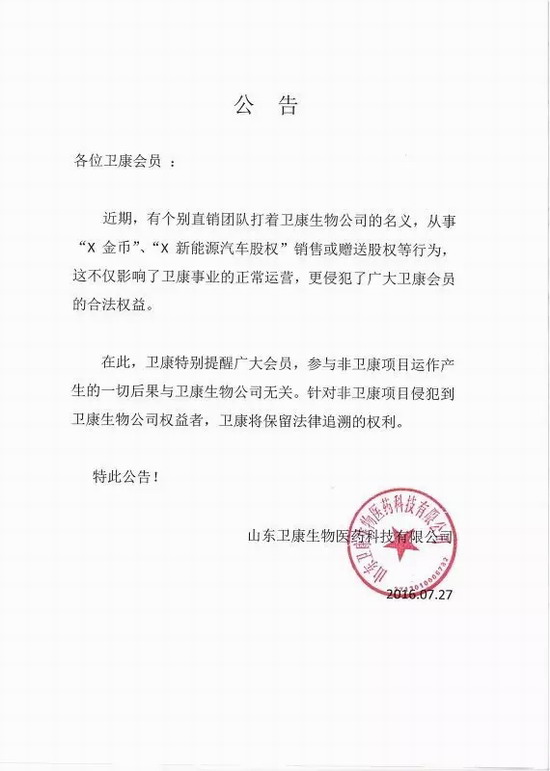 卫康发布郑重声明 严禁参与非卫康项目运作