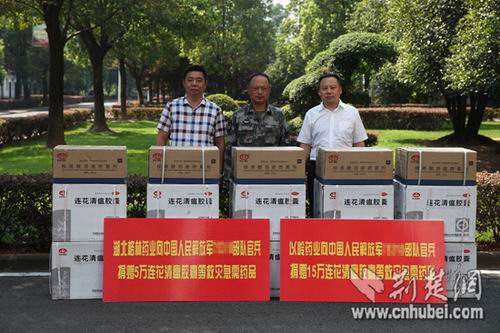 7月27日,石家庄以岭药业携手湖北格林药业向中国人民解放军某舟桥旅官兵捐赠价值20万元连花清瘟胶囊及抗生素等急需药品,用于前线抗洪救灾的解放军官兵的疾病防治。