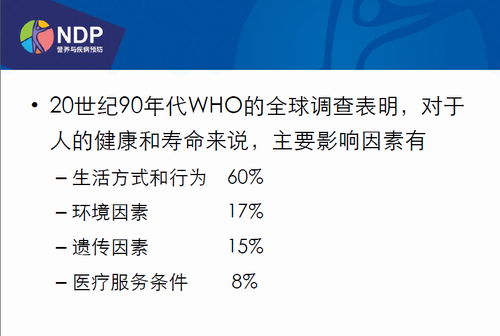 王陇德院士指出,根据20世纪90年代世界卫生组织(WHO)的全球调查表明,对于人的健康和寿命来讲,生活方式和行为的影响占到60%。而要改变生活方式和行为,首先要教给他正确的营养与疾病预防知识及技能,这是基础。