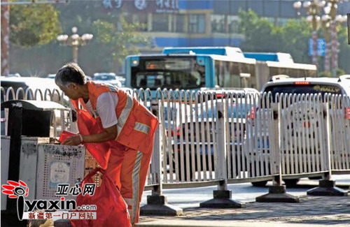 感言:环卫工在车流中捡拾路面的纸屑等垃圾,然后放入垃圾箱。希望这张图能提醒大家,保护环境,爱护家园,人人有责。