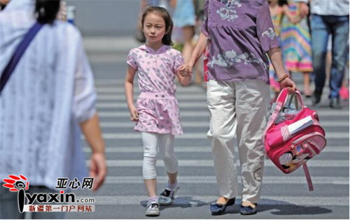 感言:小朋友在老人的带引下走斑马线过马路,文明从娃娃抓起。