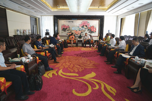 在企业展厅,杨丽琼一行首先对公司研发的中药饮片、菊皇茶等产品产生极大兴趣,详细了解这些产品的市场发展情况。在座谈会上,马兴田向杨丽琼一行介绍了康美药业的发展情况,重点介绍了在中药饮片生产管理、中药材等级分类、中药材价格指数、中药材大宗交易、中医药编码及互联网医疗等方面制定了多个国家标准,以及目前全力打造的中医药全产业链精准服务型“互联网+大健康”产业模式在全国的运营情况。