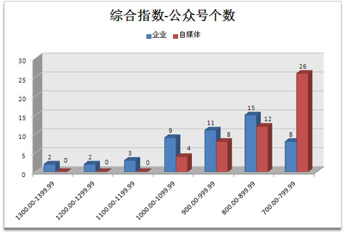 企业实力较自媒体更均衡,综合指数在800-1000的区间分布较多;自媒体无综合指数超过1100的号,综合指数在700-900区间的公众号占76%。