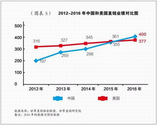 而相反地,美国直销业绩增长缓慢,近3年的年均复合增长率为4.5%,以此推算,2016年美国直销业绩约为377亿美元。因此,2016年中国直销的业绩极有可能超过美国。