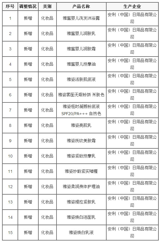 2016年7月29日,商务部直销行业管理信息系统网站公示安利(中国)日用品有限公司调整直销产品信息。安利此次新增化妆品15款。详情如下: