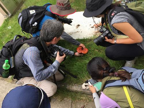 在蕈菌生态园,看到灵芝子实体,他们一个都非常激动,纷纷用照片机、摄像机记录,从品种、菌盖、菌管、菌柄等角度认真观摩,一丝不苟。