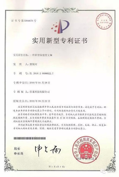 继年初,佳莱频谱面料获得发明专利证书之后,只隔短短半年时间,佳莱频谱科技又创新高!就在7月7日,佳莱再一次传来佳音:在佳莱研发团队的不懈努力下,佳莱频谱文胸类产品获得了由国家知识产权局特别颁发的《实用新型专利证书》,它是一款具有保健功能的美体仪,此次证书的颁发是对佳莱频谱高科技实力的肯定。掌声热烈祝贺!