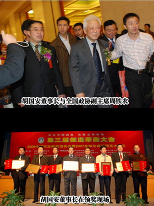 2007年12月,绿之韵集团董事长胡国安荣膺第三届杰出华商大会在北京人民大会颁发的“2007年全球华商生物医药行业十大管理英才”
