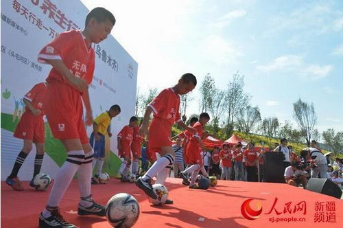 活动中,还有10名来自乌鲁木齐市104中学的小学生现场表演了精彩的花式足球,娴熟球技引得行走日参与者阵阵喝彩。据悉,该小学是"无限极快乐足球"公益项目的资助学校,参与者们的报名捐款将带给孩子们梦想得到的足球、球服、球鞋、球门等,及大学生志愿者教练。