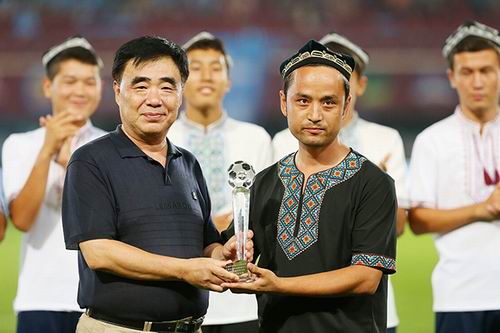 天津市体育局正局级巡视员赵普新向和田足球少年们颁发希望杯