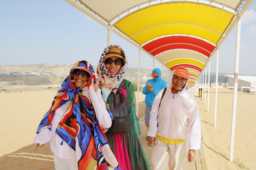 2日上午,大家一同抵达了“世界罕见,中国之最”的银肯响沙湾,它就像一根挂在黄河上的弦,金黄色的沙坡浩瀚无际,在蓝天白云下又好似一条金黄色的卧龙,风一吹,沙子如水流动,沙沙作响,像一曲激昂澎湃的交响乐。索道、穿沙袜、沙漠冲浪车、滑沙、骑骆驼、高空滑索......妙趣横生,大家玩得流连忘返!