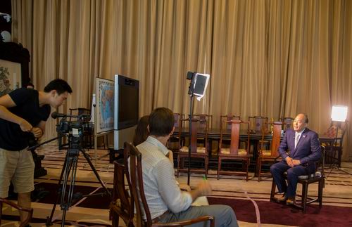 2016年8月9日,天狮集团李金元董事长在天狮国际健康产业园董事长办公室,接受了美国彭博新闻社亚太区记者毛梦璟、电视记者Tom Mackenzie的专访,李金元董事长介绍了自己创立天狮大健康事业的难忘经历,分享了自己对中国直销行业发展的感悟,分享了自己的慈善观和责任观,并和来访记者畅谈了天狮集团“一体两翼”的发展战略布局与美好未来。