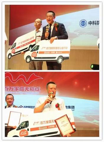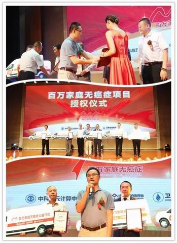 五辆“百万家庭无癌症”体检车的授车仪式再次将现场推向高潮,百万家庭无癌症推广办公室主任罗亮与集团副董事长、高级副总裁王玉平为五位区域代理商进行了授车,会后,他们将驾驶着体检车奔赴全国各地,为卫康家人提供癌症体检服务。