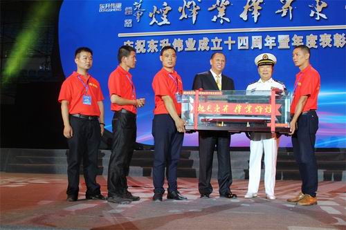 上午颁奖盛典于城先生、周长国先生、销售部于艳萍经理首先为18位《最佳坚守贡献奖》的获得者颁发了奖杯和证书。大晟泽安商务创业联盟获得了年度《杰出团队贡献奖》,副董事长谢蕙竹女士为他们颁发了奖牌。陪伴东升伟业十四年的华星系统创始人李岩松、矫捷伉俪获得了《忠诚领袖突出贡献奖》,于爱东董事长为李岩松、矫捷伉俪颁发了《忠诚领袖突出贡献奖》奖杯。颁奖盛典接近尾声时,海军少将吴方臣将军向东升伟业董事长于爱东先生隆重赠送了辽宁号航空母舰模型,寓意东升伟业将成为民族直销企业中的航空母舰,扬帆远航!于爱东董事长将航母歼十五战斗机模型分别赠送给了五大系统领导人。