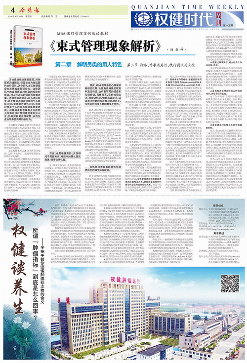 2016年8月26日,《今晚报•权健时代周刊》刊发了专栏“权健谈养生”的《所谓“肿瘤指标”到底是怎么回事?》,并且继续连载《束式管理现象解析》一书。