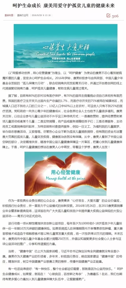 8月28日,行业权威媒体直销行业网发表文章《呵护生命成长 康美用爱守护孤贫儿童的健康未来》。
