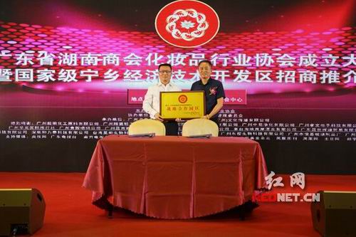 广东省湖南商会化妆品行业协会会长郭光辉(右)代表广东省湖南商会化妆品行业协会授予宁乡经开区“战略合作园区”称号