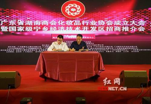 刘辉(左)代表宁乡经开区和广东省湖南商会化妆品行业协会签订了战略合作协议