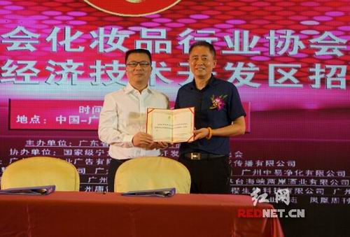 刘辉(左)代表宁乡经开区聘请广东省湖南商会化妆品行业协会会长郭光辉担任园区保健品化妆品产业发展顾问