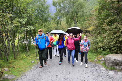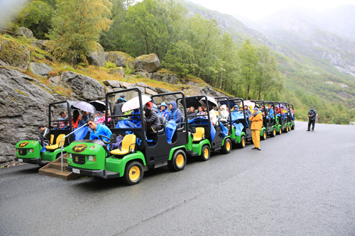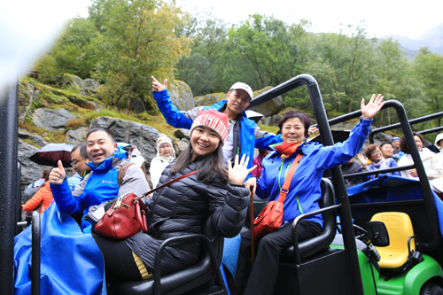 与峡湾同样壮观的还有挪威最大的万年冰川——布里克斯达尔冰川。连绵的高山、串珠式的瀑布、壮阔的峡谷与冰川浑然天成,大自然之美超出了我们的想象。大家搭乘电动观光车前往山峰,来到冰川脚下,一睹静卧在山谷间的天蓝色冰川的独有风采,无不兴奋不已。