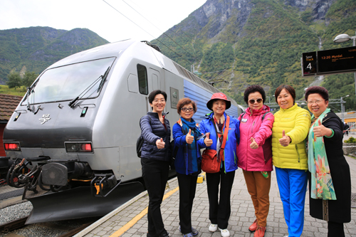 作为欧洲十大观光铁路之一,被誉为奇迹的“FLAMSBANA”山地火车令人十分期待。大家来到弗洛姆小镇,乘坐这趟具有60多年历史的山地火车,体验了从海拔2米急剧上升到866米的惊奇旅程。尽管这段线路只有短短20公里,但却有无数急弯和陡坡,特别是20个隧道全部由人工历时20年挖建而成,令人感慨人类的伟大。火车沿途的景色更是美不胜收,肖斯弗森瀑布由高山倾泻而下,蔚为壮观,再加之周围的群山峡谷、绿树清泉,着实让大家感到无比震撼。