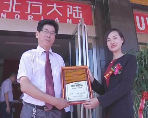 北方大陆渠道部经理郭盈君女士为信阳专营店店主方应哲先生授专营店授权牌