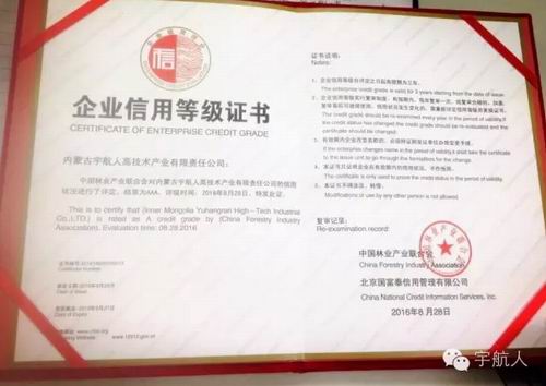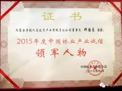 宇航人凭借多年的诚信经营和林产业方面突出贡献,荣膺首批AAA级《企业信用等级证书》,宇航人公司董事长邢国良先生因在推动我国林业产业发展中所做出的卓越贡献,荣获《2015年度中国林业产业诚信领军人物》奖。