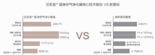 三生中国宜+超净空气净化器在CADR,CCM,净化能效,噪音四大方面的指数远远超过新国标标准,能在满足最新空气指标的基础上,增大空气洁净量,提高净化能效,加强洁净速度,让室内空气一年四季都持久清新。
