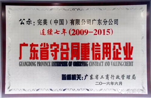 近日,广东省工商行政管理局评定颁发“广东省守合同重信用企业”奖项,完美广东分公司连续七年(2009-2015年)获此殊荣。