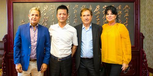 束昱辉董事长与大加那利保税区市长玛利亚女士(右一)、西班牙红十字会主席胡安先生(右二)、拉斯帕尔马斯足球俱乐部主席尼古拉先生(左一)合影