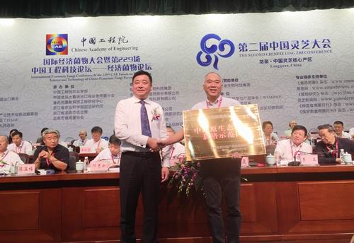 开幕式上,龙泉市人民政府副市长何登新接受国际药用菌学会执行主席、安惠公司董事长陈惠给颁发的中国原生态灵芝栽培示范区的铜牌。