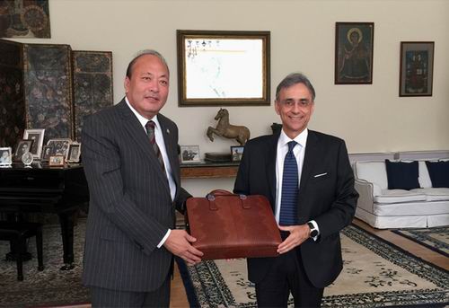 近日,李金元董事长受邀赴意大利驻中国大使馆,会见了老朋友意大利驻华大使谢国谊(ETTORE SEQUI)先生,双方就中意两国民间友谊和未来商业合作项目友好交流,并约定谢国谊大使近期参观访问天狮集团总部,推动相关合作项目落地,促进双方文化交流与合作。