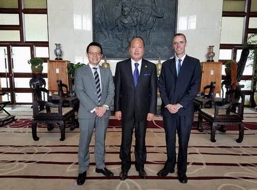 李金元董事长(中)与澳大利亚驻华大使馆商务参赞(右)及澳贸委高级商务官(左)合影