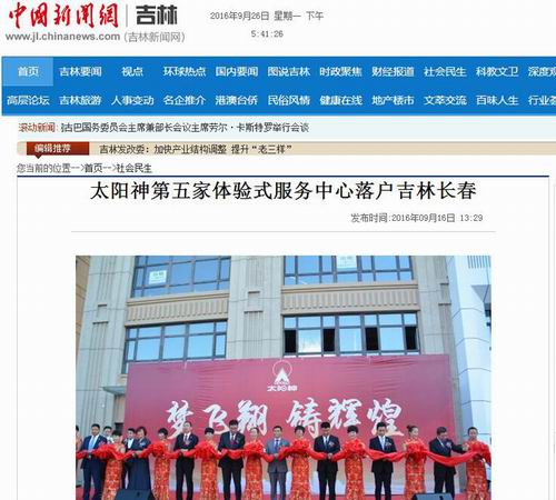 开业当天,中国新闻网就以《太阳神第五家体验式服务中心落户吉林长春》为题,从太阳神的发展规划,吉林形象体验中心落成对于东北市场及社会的意义,体验中心的具体功能和太阳神的事业优势等方面进行了详实的报道,并表示了充分的赞扬和肯定。