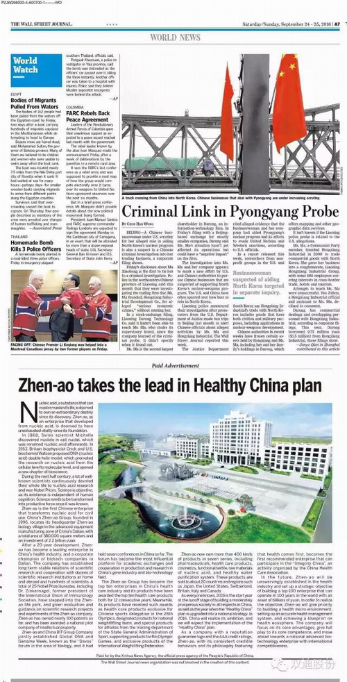近日,美国《华尔街日报》报道了《珍奥引领健康中国》一文,与克强总理出访加拿大蒙特利尔同一版面。