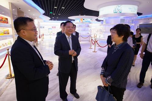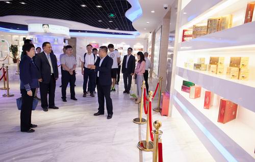 在李董事长等人的陪同下,穆副司长一行人参观了设计时尚、配置高端的金日全球会员服务中心。在产品展厅,集团总裁办李万年主任为来宾们介绍了金日集团各类产品,包括药品、保健品、日化用品及高端滋补品等,涵盖了传统商超卖场、OTC和院线、电商及直销等多渠道销售。