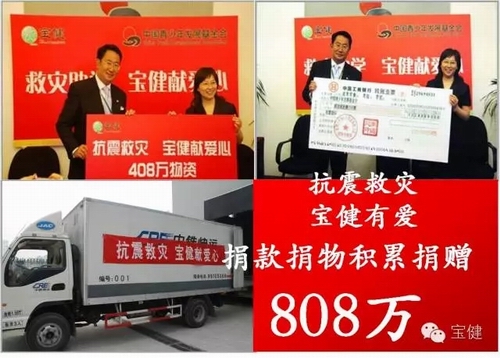 宝健人为抗震救灾和慈善项目累计捐赠近两亿元,公益捐赠与营业额占比位居行业第一,图为汶川地震捐赠情况。