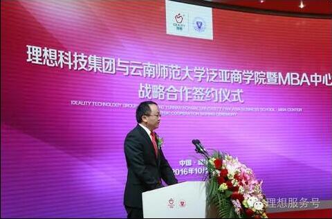 2016年10月8日,“理想科技集团与云南师范大学泛亚商学院实习实训基地签约仪式”在理想科技集团公司隆重召开。云南师范大学泛亚商学院院长兼MBA中心常务副主任杨永生,学院党总支书陈玉林,学院副院长、MBA中心副主任李艳,学院教务办公室主任、院长助理陈长瑶,理想科技集团党委书记、董事、总裁灵晓燕博士,常务副总裁蒋宝华,党委副书记、副总裁李伟剑,副总裁徐超,副总裁郑丹丹等领导一起参与了本次的签约仪式。